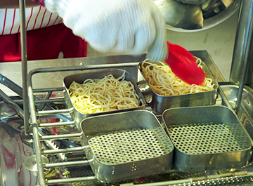 Seasoned noodles being placed in the frying molds before going into the deep frying.